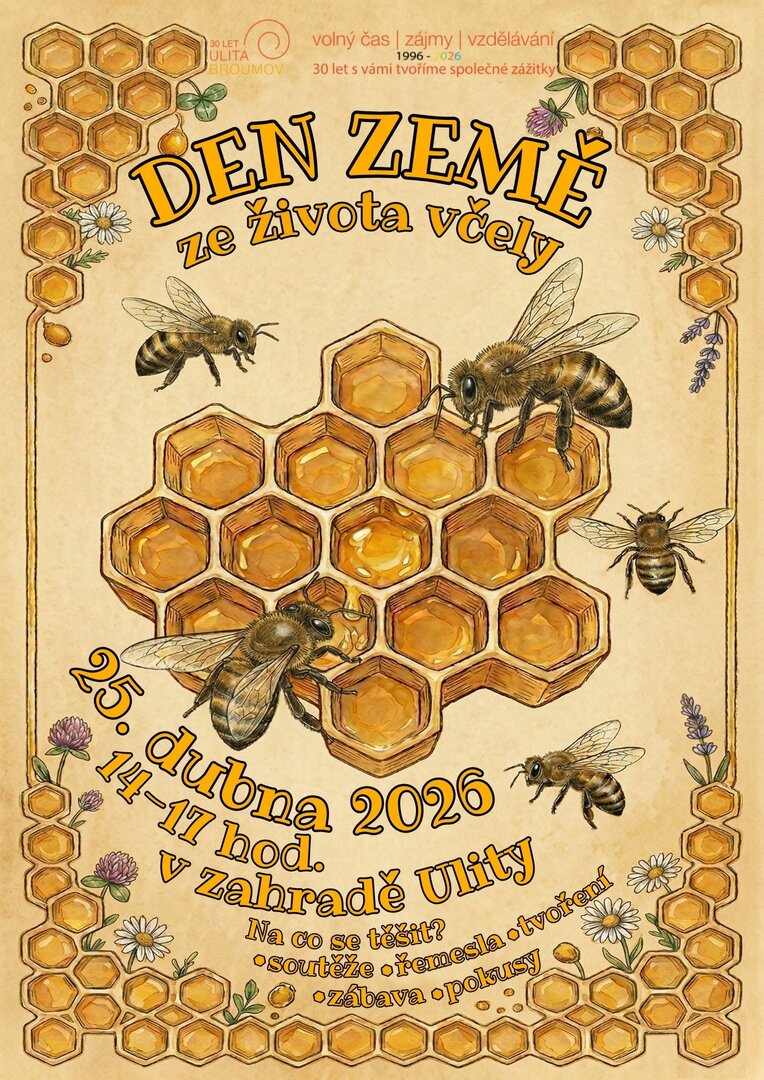 Přijďte s námi oslavit svátek naší planety a nahlédnout do fascinujícího světa včel! V rámci oslav 30 let Ulity Broumov vás zveme v sobotu 25. dubna 2026 od 14:00 do 17:00 do zahrady Ulity. Čeká vás odpoledne plné hravého objevování, kde si vyzkoušíte zajímavá řemesla, tvoření a napínavé pokusy. Pro děti jsou připraveny tematické soutěže a spousta zábavy, která přiblíží důležitou roli včel v naší přírodě. Těšíme se na společné zážitky v rozkvetlé zahradě!