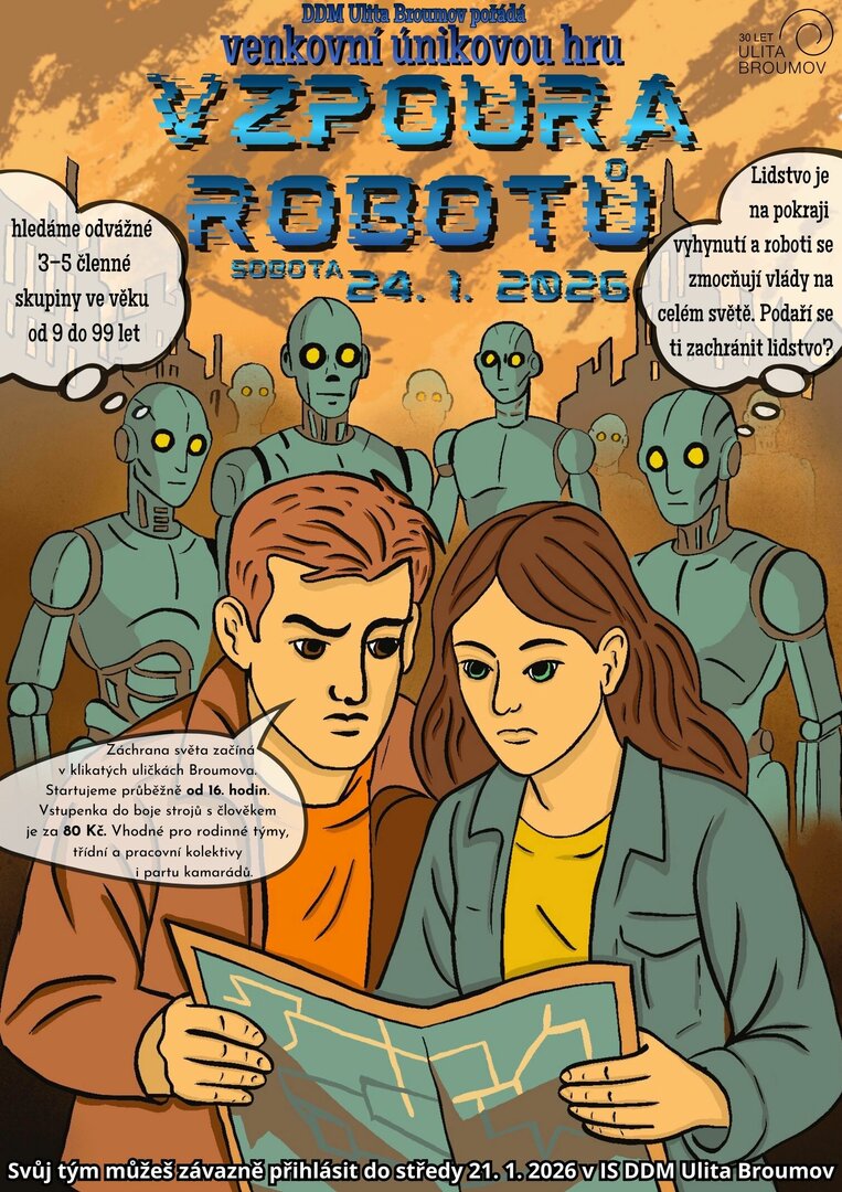 Dům dětí a mládeže Ulita v Broumově zve na venkovní únikovou hru Vzpoura robotů. Vhodné pro rodinné týmy, třídní a pracovní kolektivy.