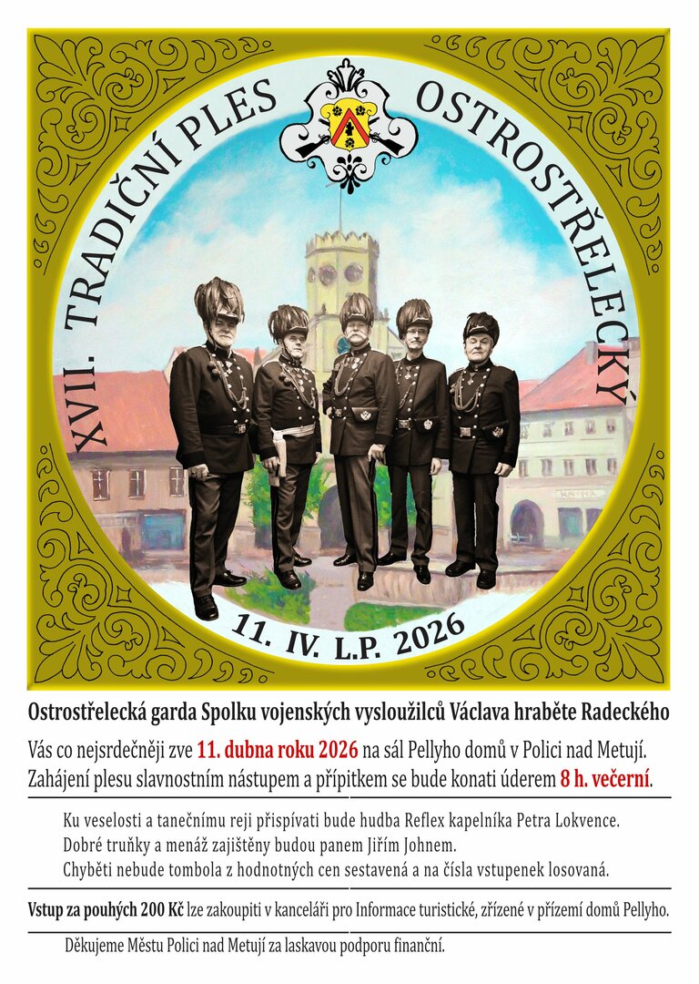 Ostrostřelecká garda Spolku vojenských vysloužilců Václava hraběte Radeckého zve na XVII. Tradiční ples ostrostřelecký, který se uskuteční v sobotu 11. dubna 2026 na sále Pellyho domů v Polici nad Metují. Ples bude zahájen úderem 20. hodiny slavnostním nástupem a přípitkem. K tanci a poslechu zahraje hudba Reflex kapelníka Petra Lokvence, o bohaté občerstvení se postará Jiří John a chybět nebude ani losovaná tombola o hodnotné ceny.