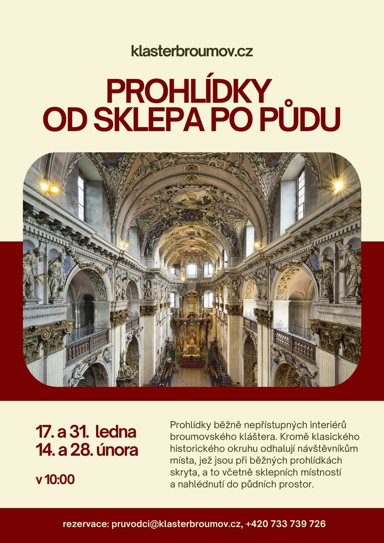 Zveme Vás 17. a 31.1. a 14. a 28.2. od 10:00 hod. na prohlídky běžně nepřístupných interiérů broumovského kláštera. Kromě klasického historického okruhu odhalují návštěvníkům místa, jež jsou při běžných prohlídkách skryta, a to včetně sklepních místností a nahlédnutí do půdních prostor.