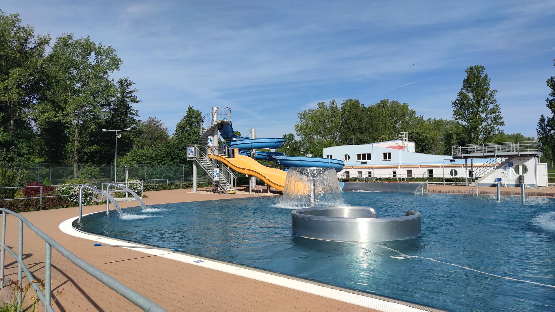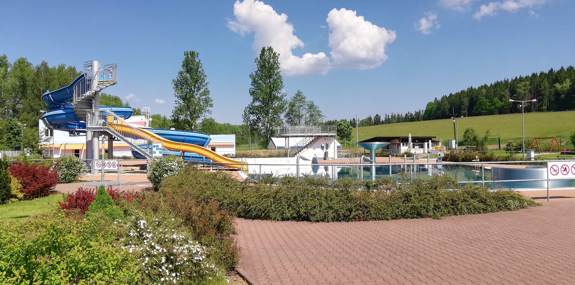 Návštěvníci mohou využít plavecký bazén o délce 25 metrů se čtyřmi drahami a hloubkou do 180 cm. Pro relaxaci je k dispozici rekreační bazén nepravidelného tvaru s vodními chrliči a masážními tryskami (hloubka do 120 cm), na který navazuje 60 m tobogán a široká skluzavka. Nejmenší děti potěší dětský bazén se skluzem mezi hladinami, vodním zvonem a dnovou perličkou.