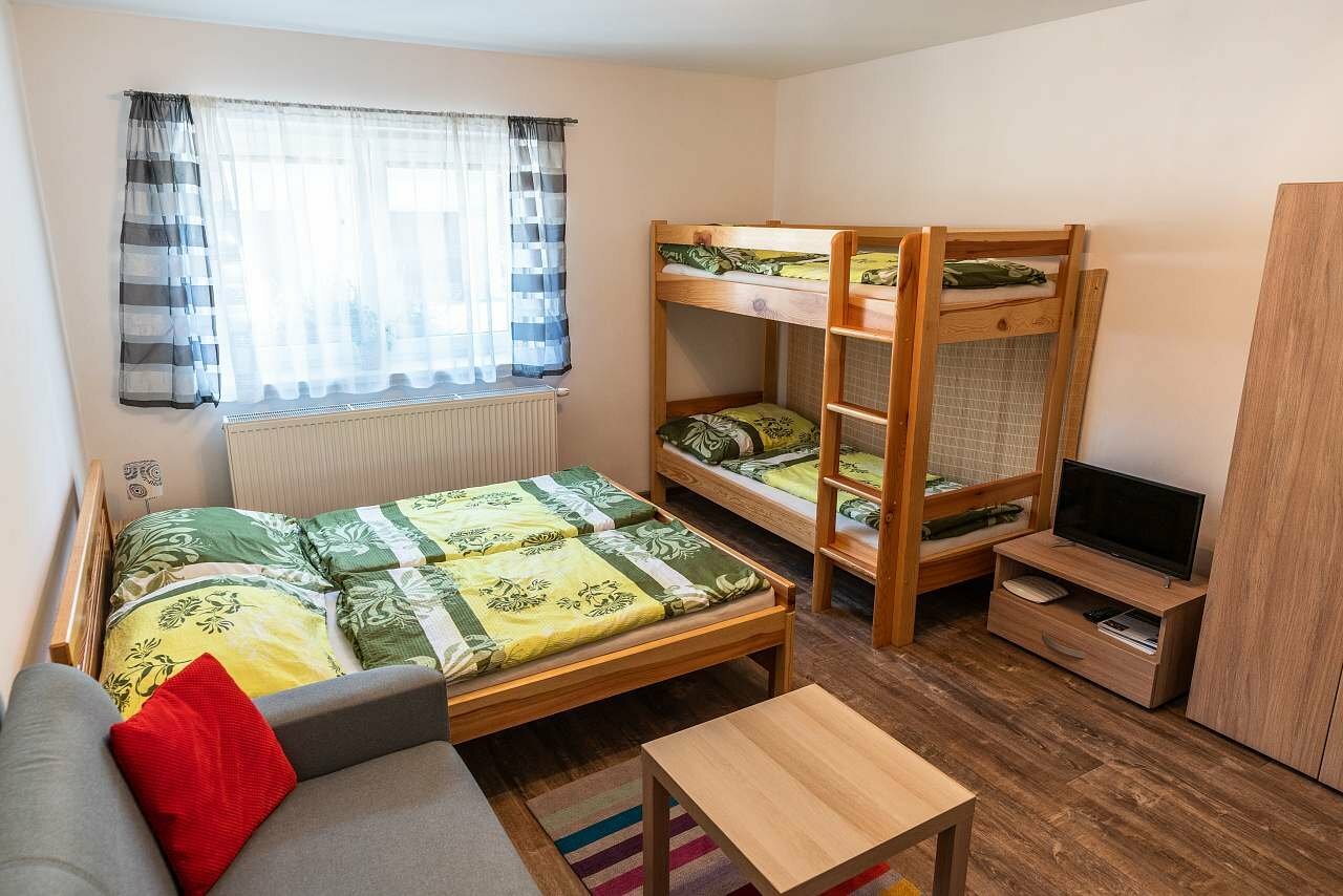 Během celého roku se můžete ubytovat ve dvou nově zrekonstruovaných apartmánech. Apartmány mají společný vchod a jsou podobné dispozičně i vybavením. Apartmán s jednou ložnicí je tvořen ložnicí, ve které naleznete manželskou postel, patrovou postel a gauč, který může sloužit jako přistýlka pro jednu osobu. Také je k dispozici televizi se satelitním příjmem. Apartmán se dvěma ložnicemi má kromě podobné ložnice s manželskou postelí a palandou ještě jednu ložnici s manželskou postelí, gaučem a dvěma křesly.