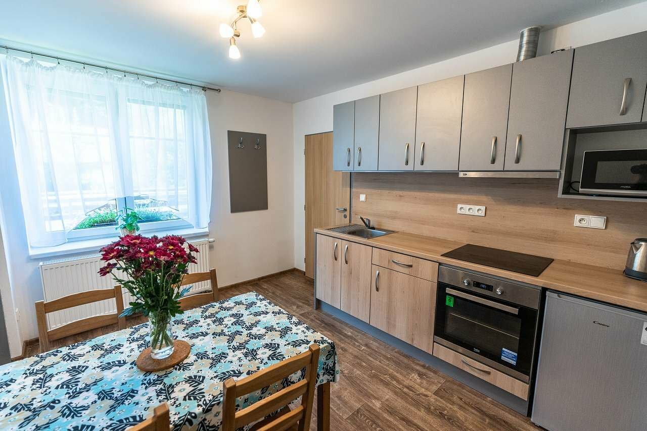 V kuchyni je k využití připravena indukční varná deska, elektrická trouba, mikrovlnná trouba i chladnička s mrazákem, nechybí jídelní posezení. Každý apartmán disponuje vlastní koupelnou se sprchovým koutem a toaletou. V obou apartmánech je dostupné WiFi připojení na internet. Na pozemku u apartmánů je k dispozici venkovní posezení v altánu s grilem. Děti si užijí dětský bazén a trampolínu. Cyklisty potěší možnost bezpečného odložení kol ve vyhrazeném prostoru. Parkování je zajištěno pro tři auta na oploceném pozemku.