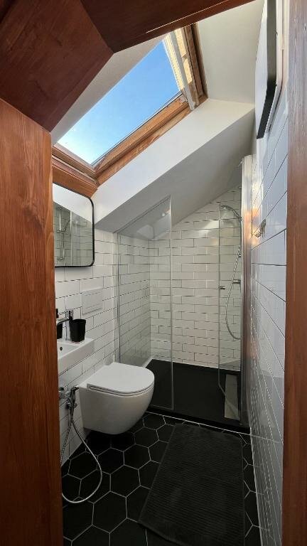koupelna se sprchovým koutem, toaleta, předsíň, terasovitá zahrada a parkoviště.